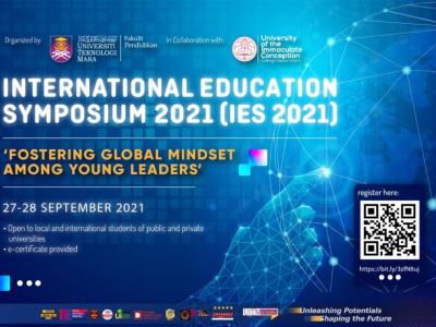 Pada 27 dan 28 September 2021, Fakulti Pendidikan, Universiti Teknologi MARA (UiTM) dengan kerjasama University of the Immaculate Conception (UIC), Filipina, telah menganjurkan International Education Symposium 2021 (IES 2021) yang bertemakan “Fostering Global Mindset Among Young Leaders”. Simposium yang mensasarkan penyertaan pemimpin mahasiswa dari universiti negara-negara Asia Tenggara ini dianjurkan oleh pimpinan pelajar Fakulti Pendidikan UiTM, dengan bimbingan dan panduan para pensyarah penasihat di bawah Pejabat Hal Ehwal Pelajar (HEP), Fakulti Pendidikan. Sambutan yang diterima amat memberangsangkan dengan penyertaan pimpinan mahasiswa dari Brunei, Cambodia, Indonesia, Myanmar, Pakistan, Filipina, Singapura, Thailand, Vietnam dan tentunya tuan rumah Malaysia.